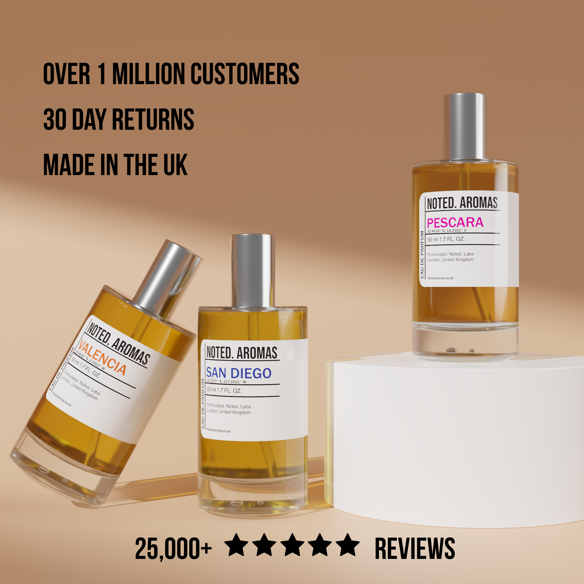 Please note that products mentioned throughout our site are a mere guide and in no circumstance should be mistaken for the actual high street, designer or niche brand. Names and copyrights, used or unused, are properties of their respective manufacturers and/or designers. Our fragrances are simply inspirations from, and are not ‘identical’ to any other fragrance or original. Our team has attempted to create near matches, to well known fragrances, but all scents are subjective. Noted Aromas are not to be confused with the original fragrances and we have no affiliation with the manufacturers of these unnamed designer brands.