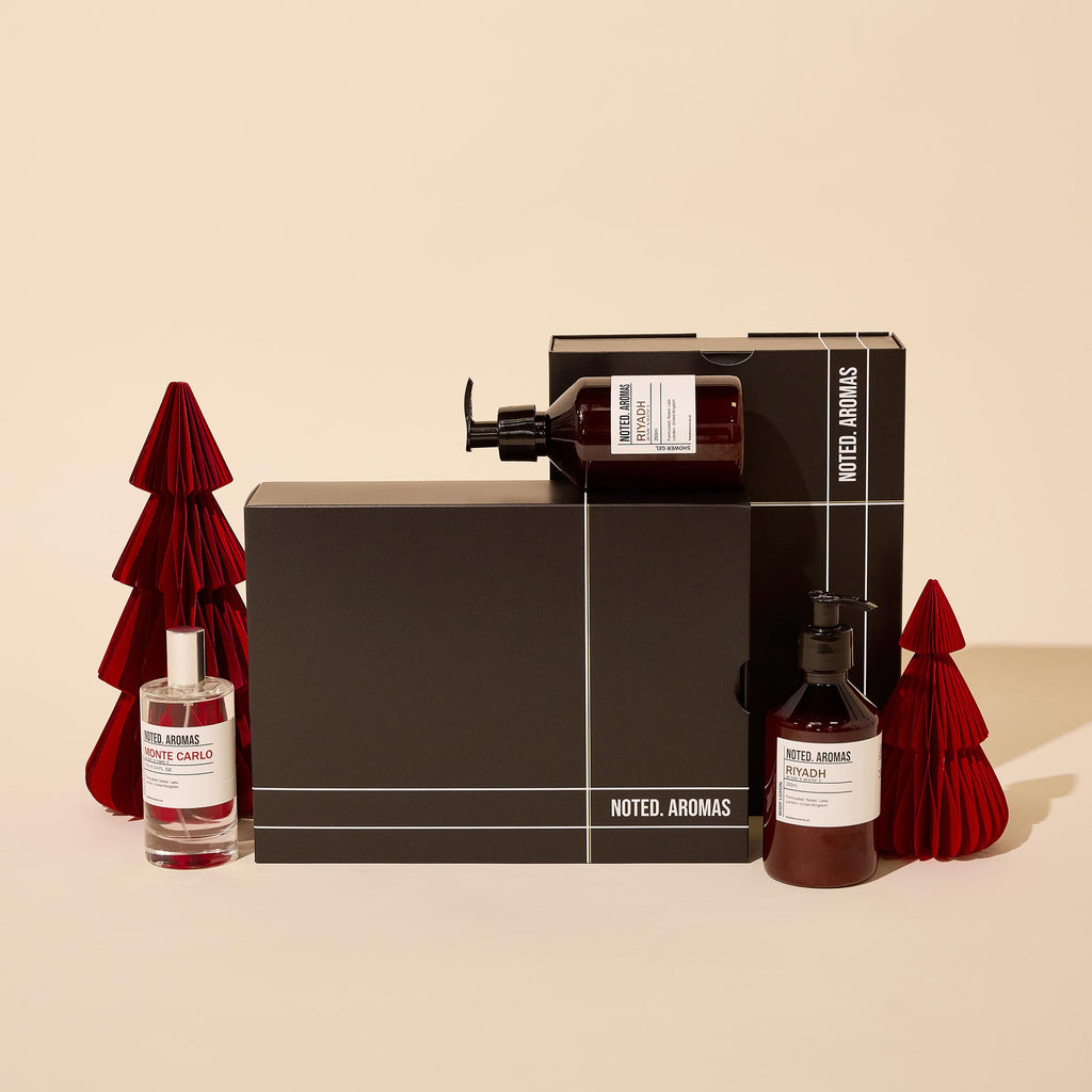 The ultimate gift for fragrance lovers, containing a 100ml Fragrance in our best-selling scent Monte Carlo, inspired by Bacaratt Rouge 540, plus a Shower Gel and Body Lotion in one of our best-selling unisex scents, Riyadh, inspired by Ombre Nomade. All presented in our Limited Edition Noted. Aromas. gift box.