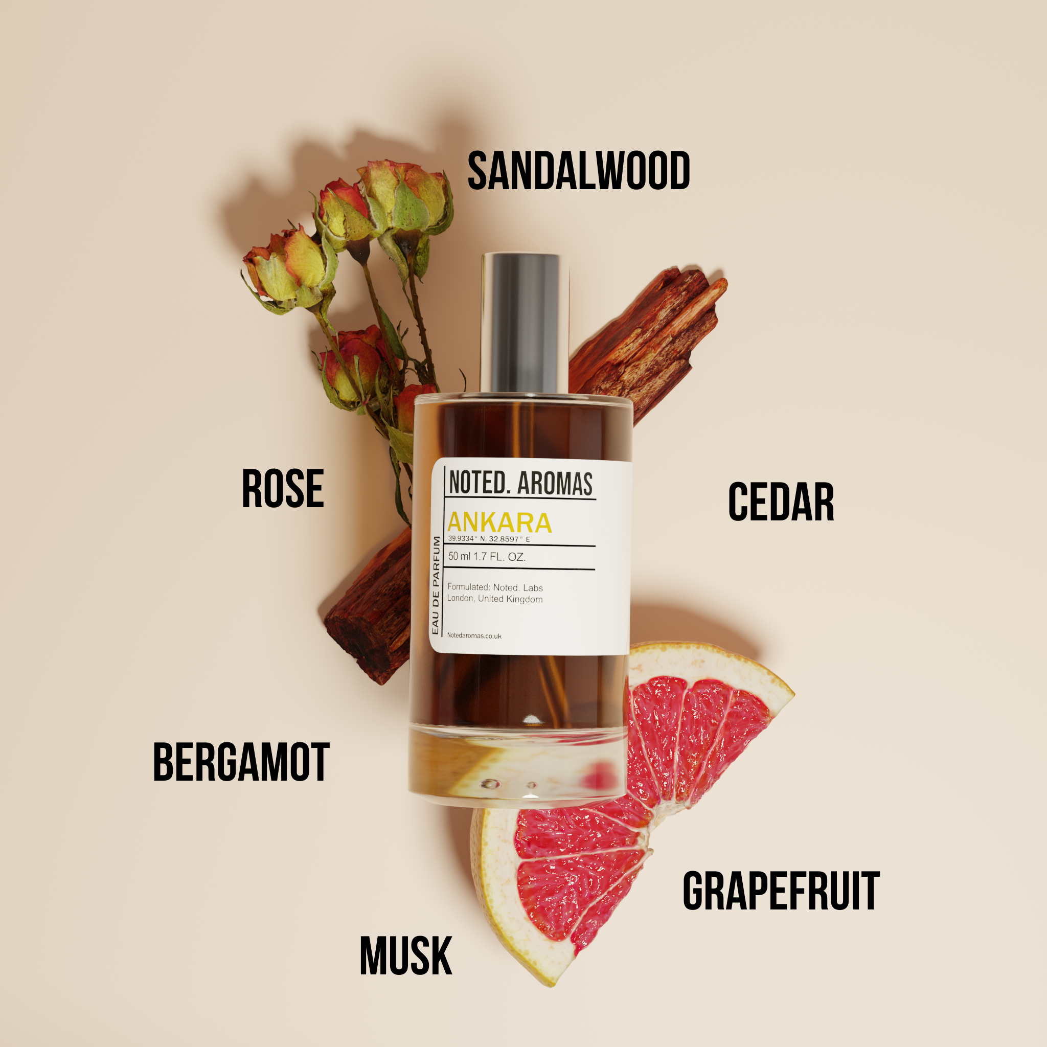Ankara - Noted. Aromas Inspired By Halfeti. This is an Amber Woody fragrance for women and men that is a modern classic, rich woody floral fragrance, that is captivating and opulent.