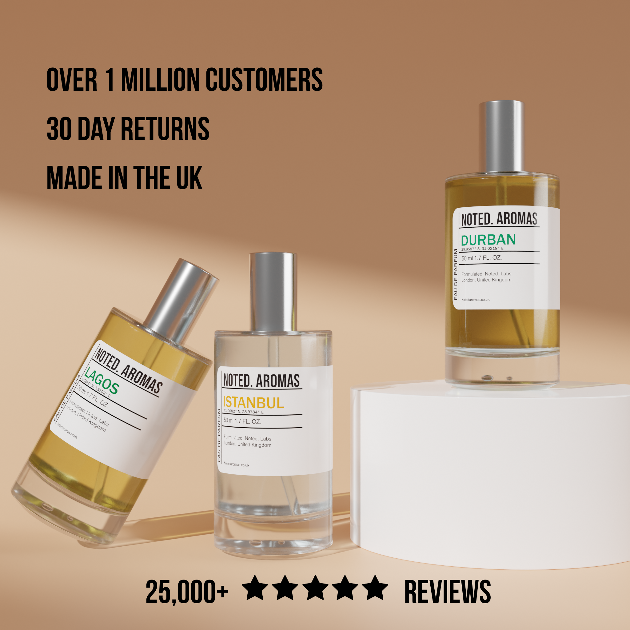 Please note that products mentioned throughout our site are a mere guide and in no circumstance should be mistaken for the actual high street, designer or niche brand. Names and copyrights, used or unused, are properties of their respective manufacturers and/or designers. Our fragrances are simply inspirations from, and are not ‘identical’ to any other fragrance or original. Our team has attempted to create near matches, to well known fragrances, but all scents are subjective. Noted Aromas are not to be confused with the original fragrances and we have no affiliation with the manufacturers of these unnamed designer brands.