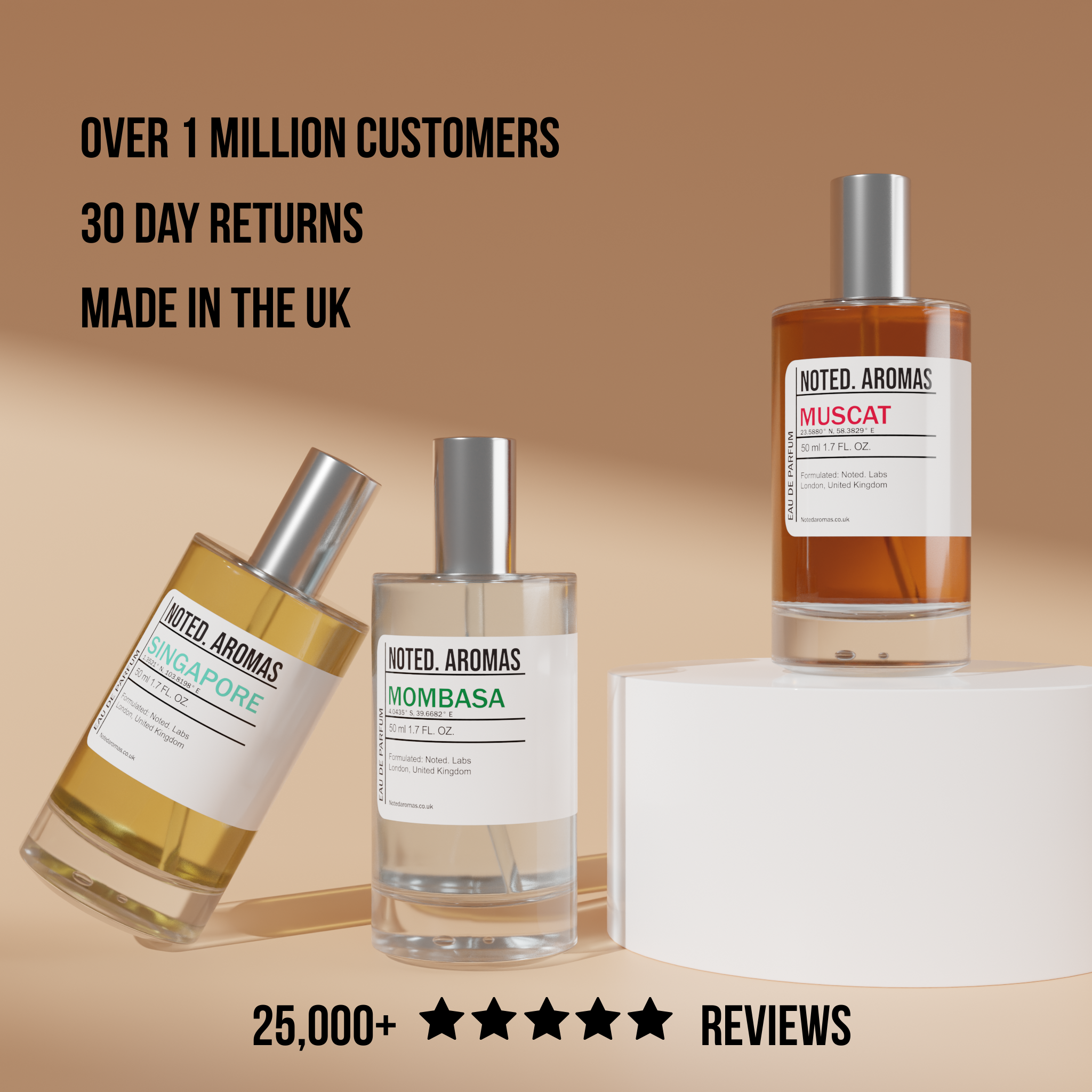 Please note that products mentioned throughout our site are a mere guide and in no circumstance should be mistaken for the actual high street, designer or niche brand. Names and copyrights, used or unused, are properties of their respective manufacturers and/or designers. Our fragrances are simply inspirations from, and are not ‘identical’ to any other fragrance or original. Our team has attempted to create near matches, to well known fragrances, but all scents are subjective. Noted Aromas are not to be confused with the original fragrances and we have no affiliation with the manufacturers of these unnamed designer brands.