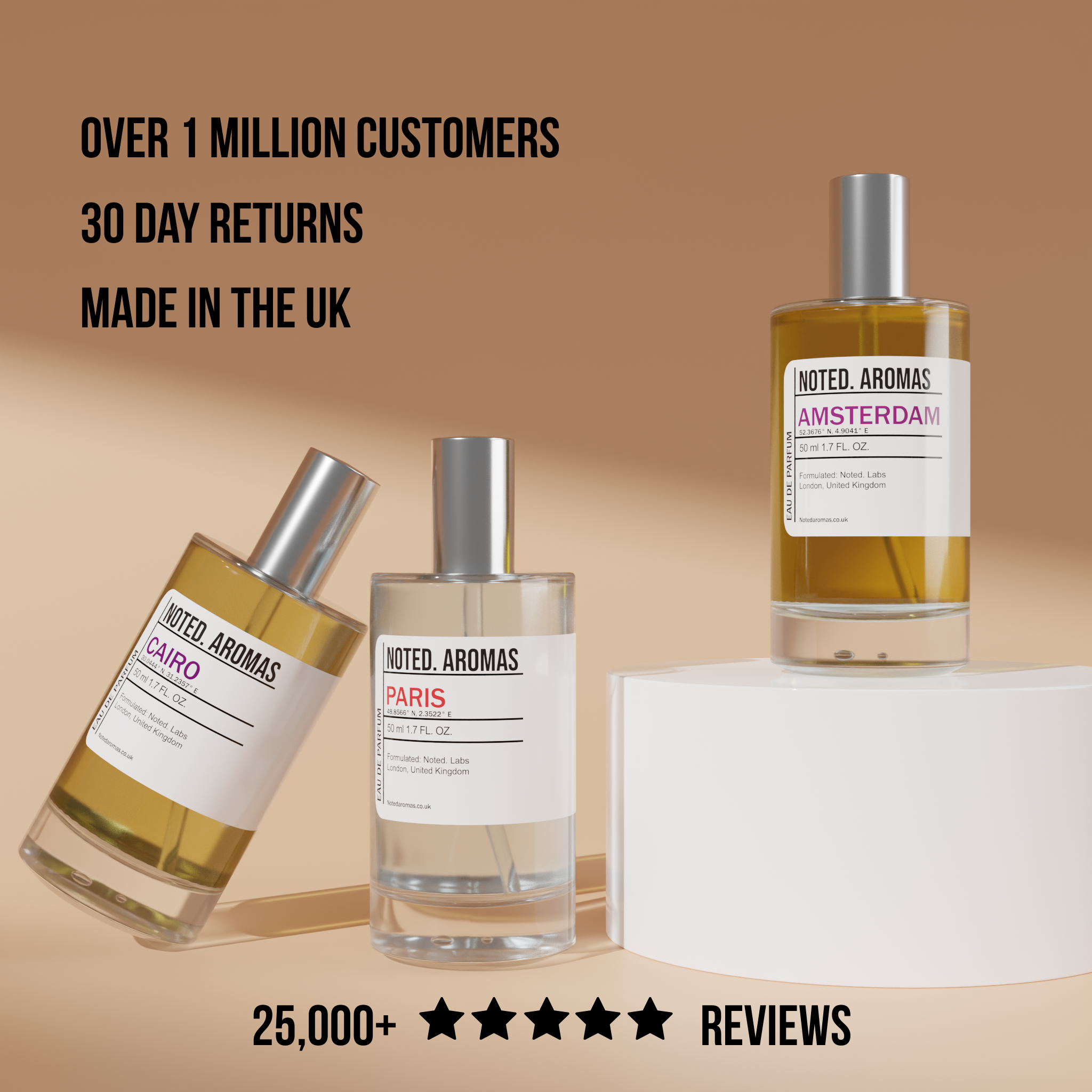 Please note that products mentioned throughout our site are a mere guide and in no circumstance should be mistaken for the actual high street, designer or niche brand. Names and copyrights, used or unused, are properties of their respective manufacturers and/or designers. Our fragrances are simply inspirations from, and are not ‘identical’ to any other fragrance or original. Our team has attempted to create near matches, to well known fragrances, but all scents are subjective. Noted Aromas are not to be confused with the original fragrances and we have no affiliation with the manufacturers of these unnamed designer brands.